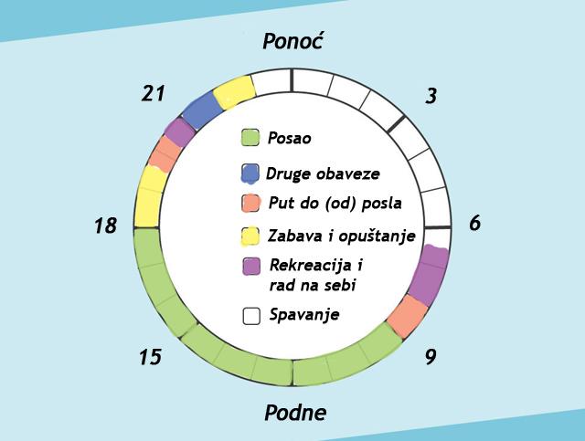Koristite isti metod i pokušajte da vizualizujete svoj radni dan. Odštampajte šablon ili ga kopirajte i otvorite u MS Paintu ili Photoshopu i popunite prema uputstvima. Na taj način ćete najbolje saznati na koje aktivnosti trošite dan, kojim aktivnostima ne posvećujete dovoljno vremena, kojima možda previše i koliko je dobar raspored.